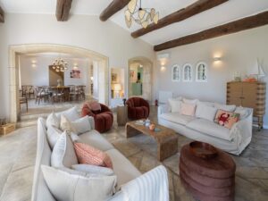 Livingroom | Large open plan living and dining room with cosy furniture, majestic fireplace, large dining table, and opening up to the gardens. | ||
