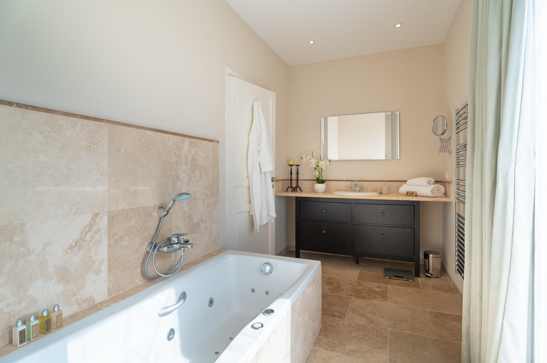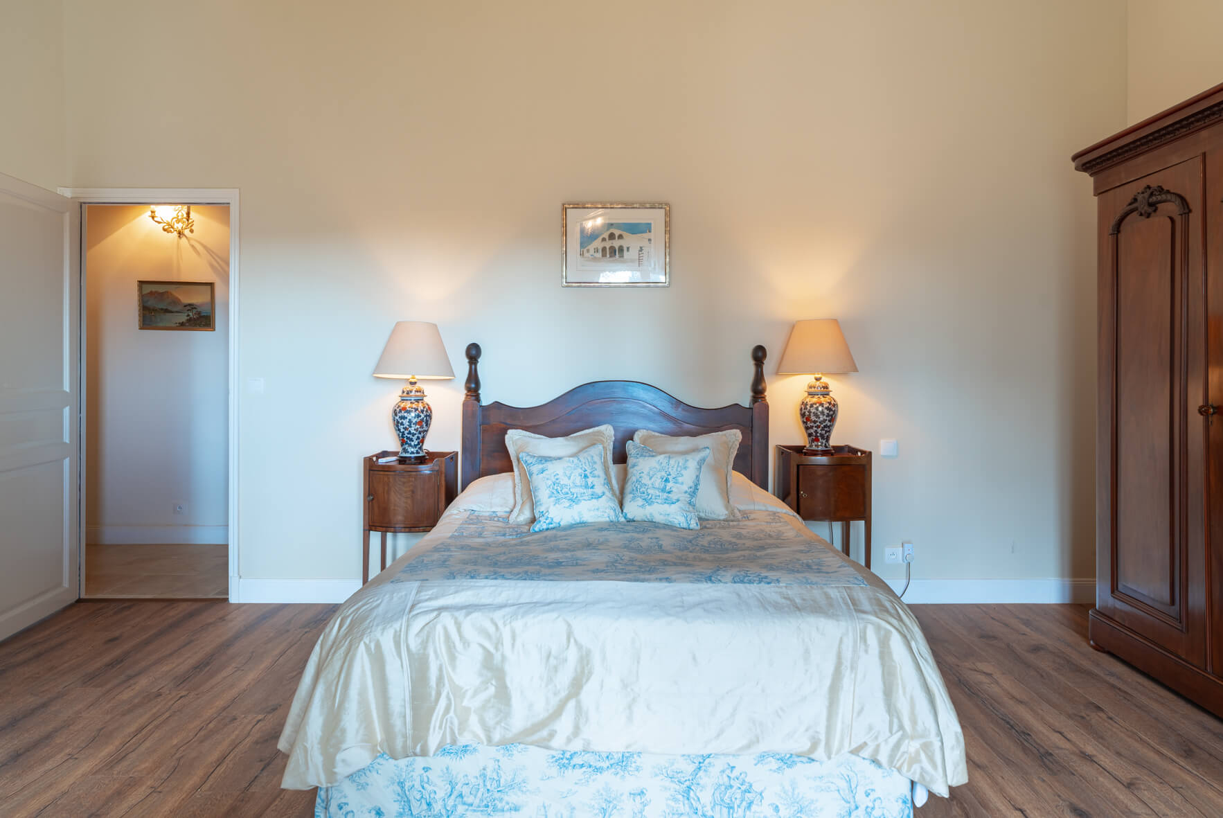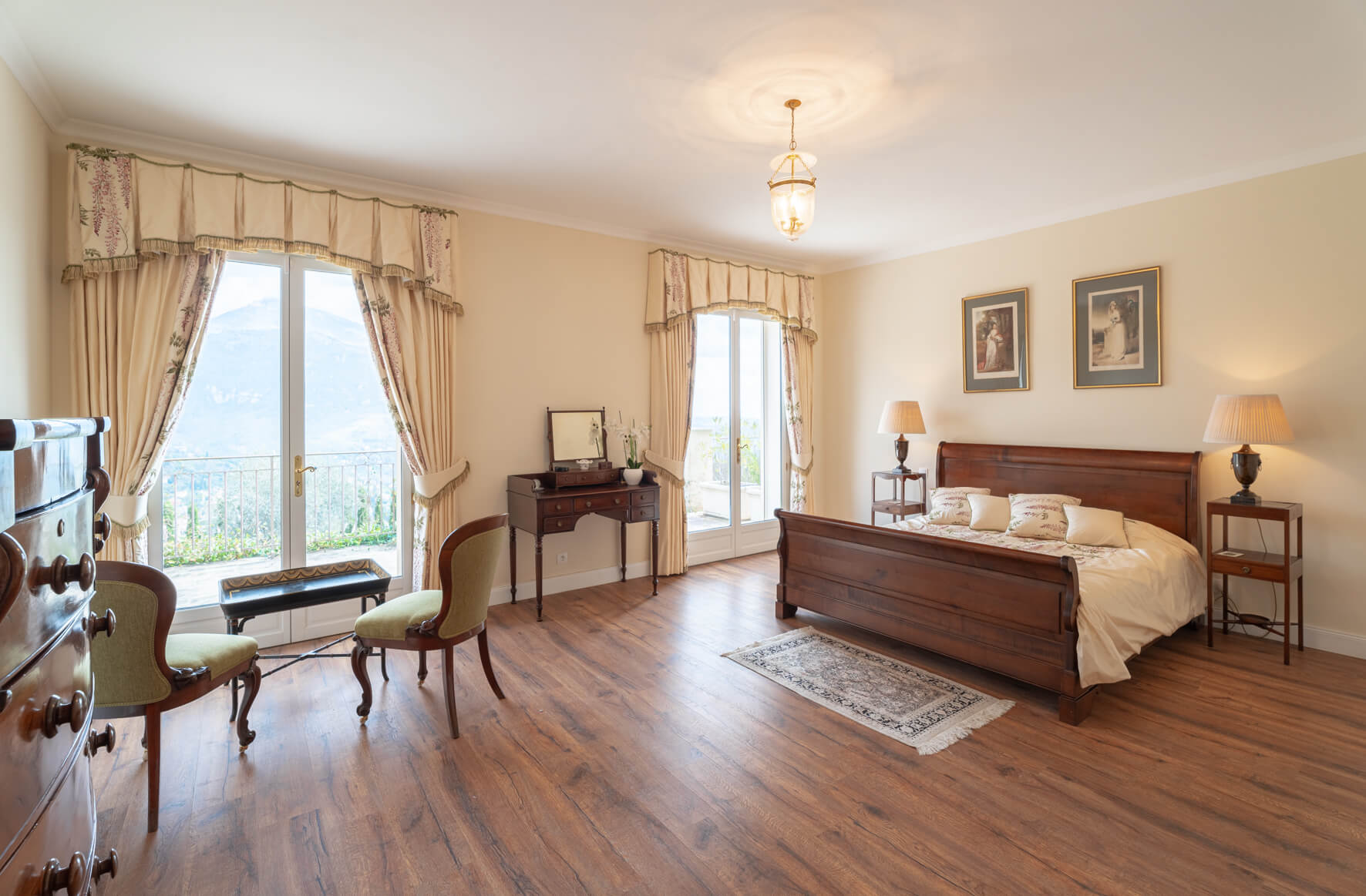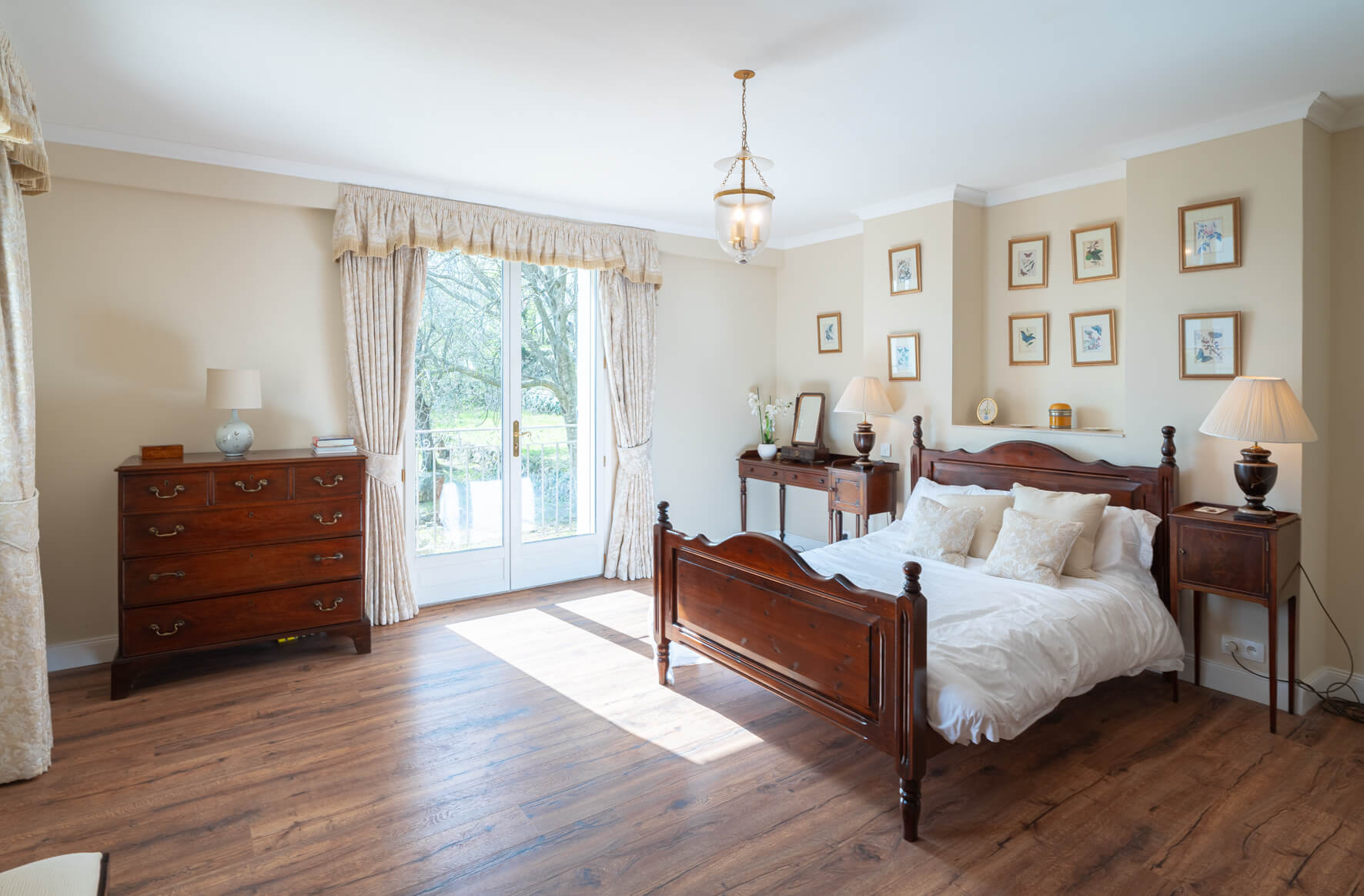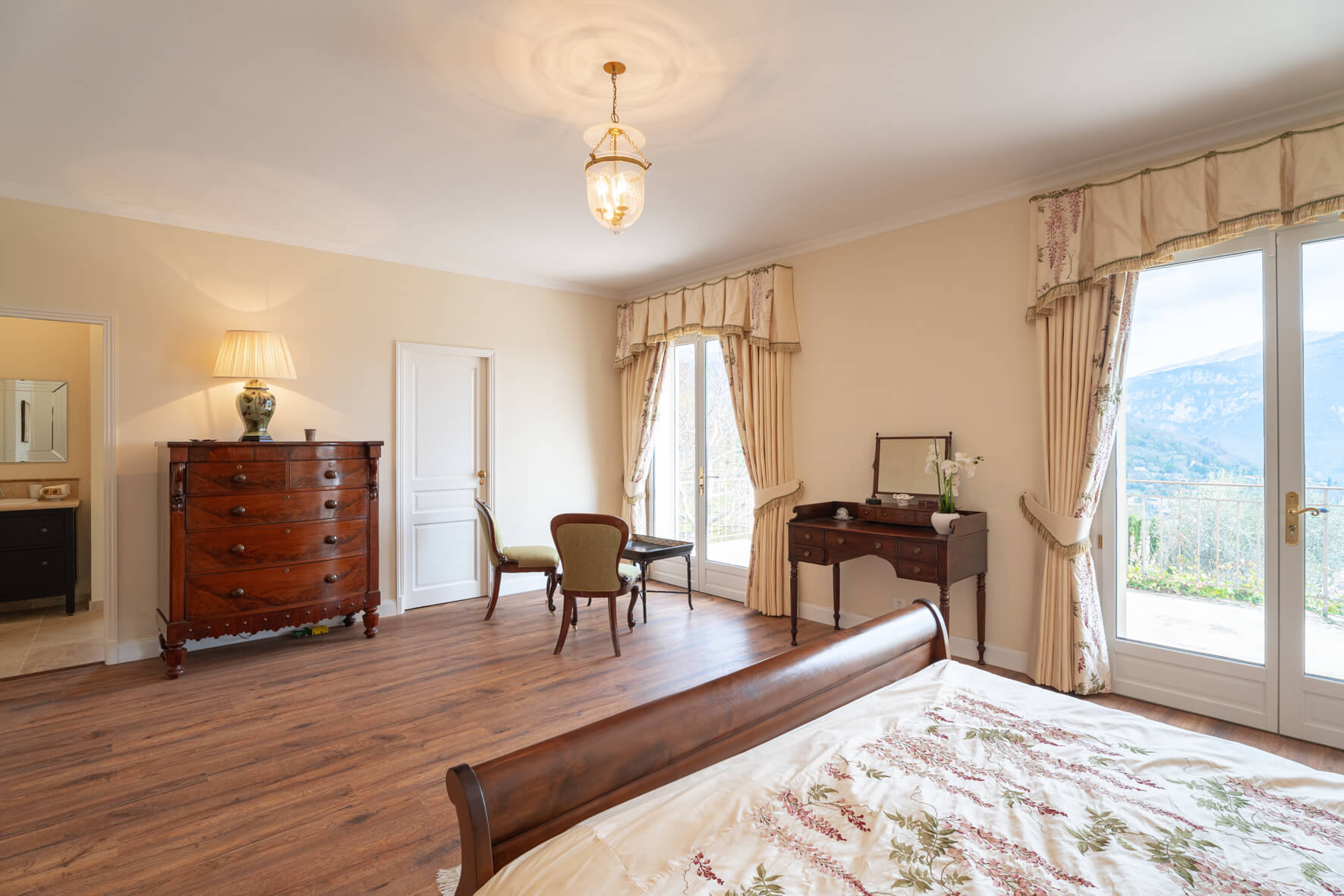 | Bedroom 1 | 2 | KING SIZE BED, AIR CONDITIONING | Double bedroom with extra large double bed and ensuite bathroom ('his and hers') one with bathtub and hand held shower, vanity and toilet, one with shower, vanity and toilet. Private balcony with beautiful views over the garden and countryside. |