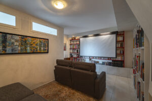 | TV Room | For movie nights, there is a cozy TV room featuring an extra-large drop-down screen and comfy sofas. |