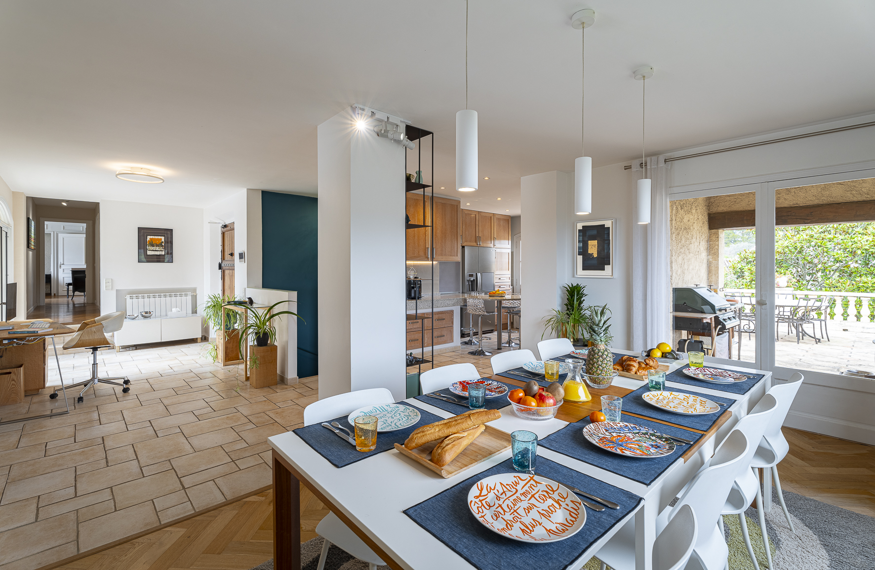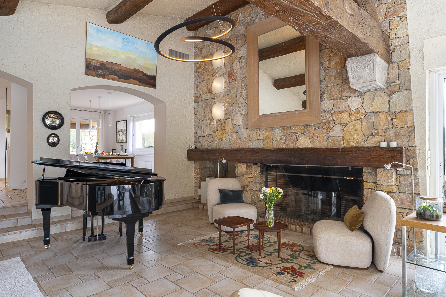 | Living Room / Dining | Spacious living room with fireplace and piano. Opening onto the garden and swimming pool. Air-conditioned. | ||