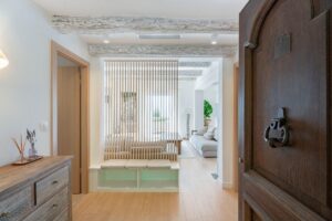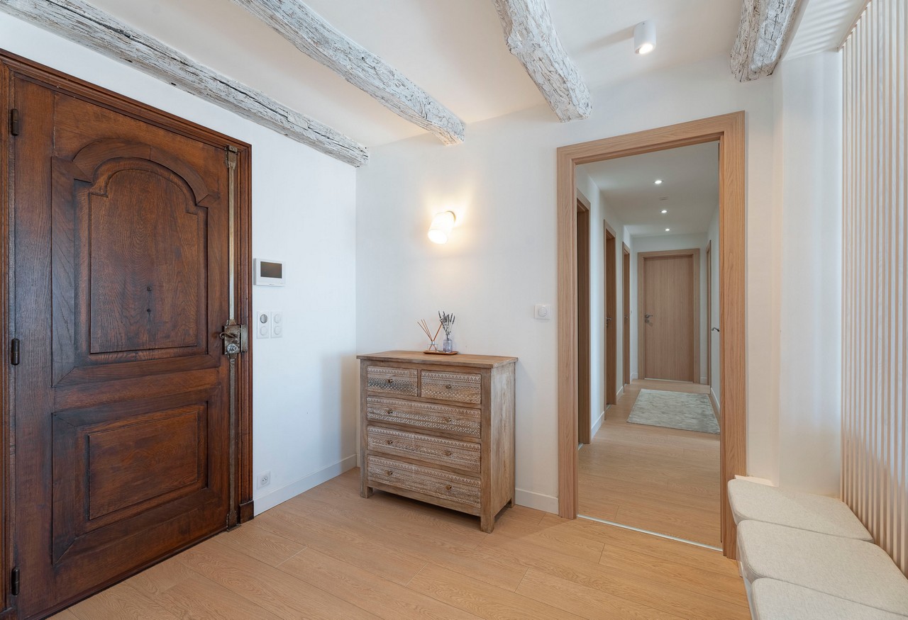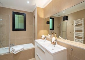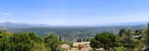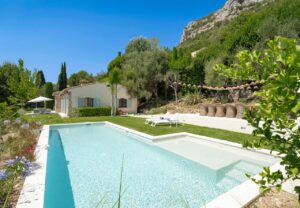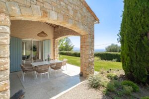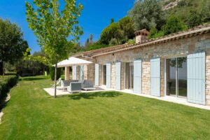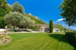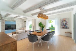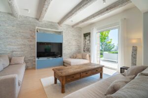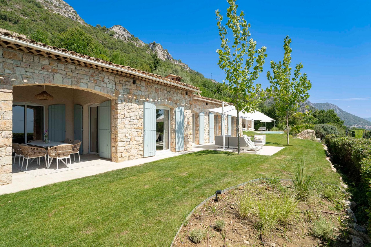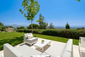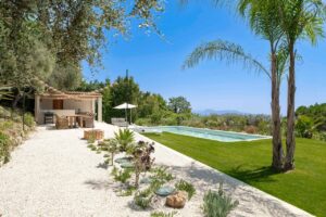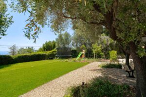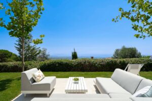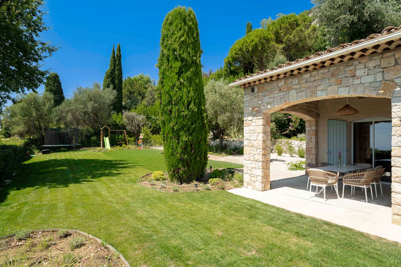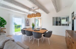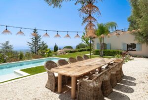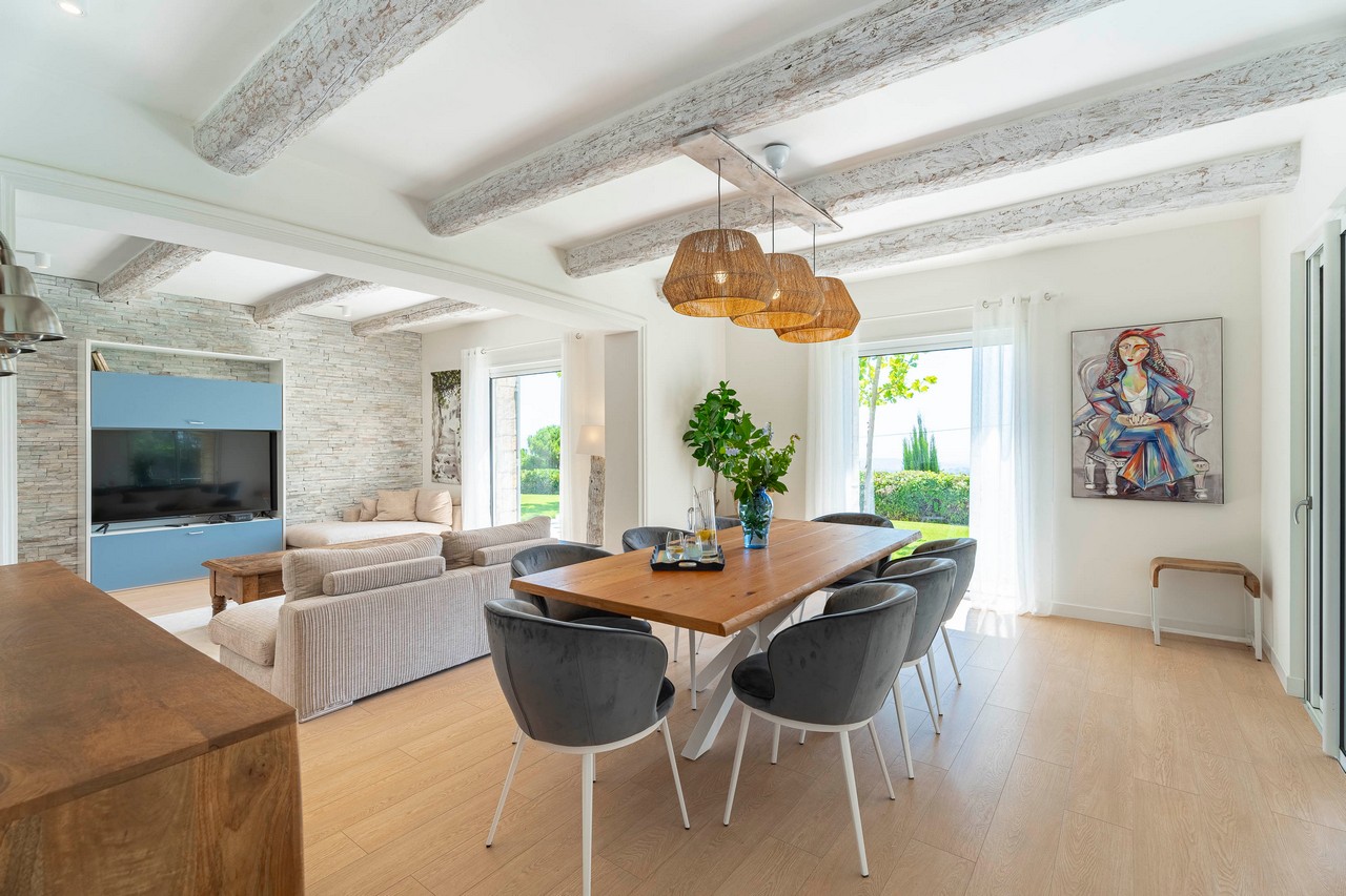 Living / Dining Room | Spacious and light double-aspect open-plan room divided into the living area and dining area. The living area has comfortable sofas and the 34cm TV is discreetly hidden when not in use. Double doors open onto the garden terrace with sofas and shaded by trees, with views over the Mediterranean. The dining area is light and spacious with double doors opening onto the garden and far reaching views. | ||