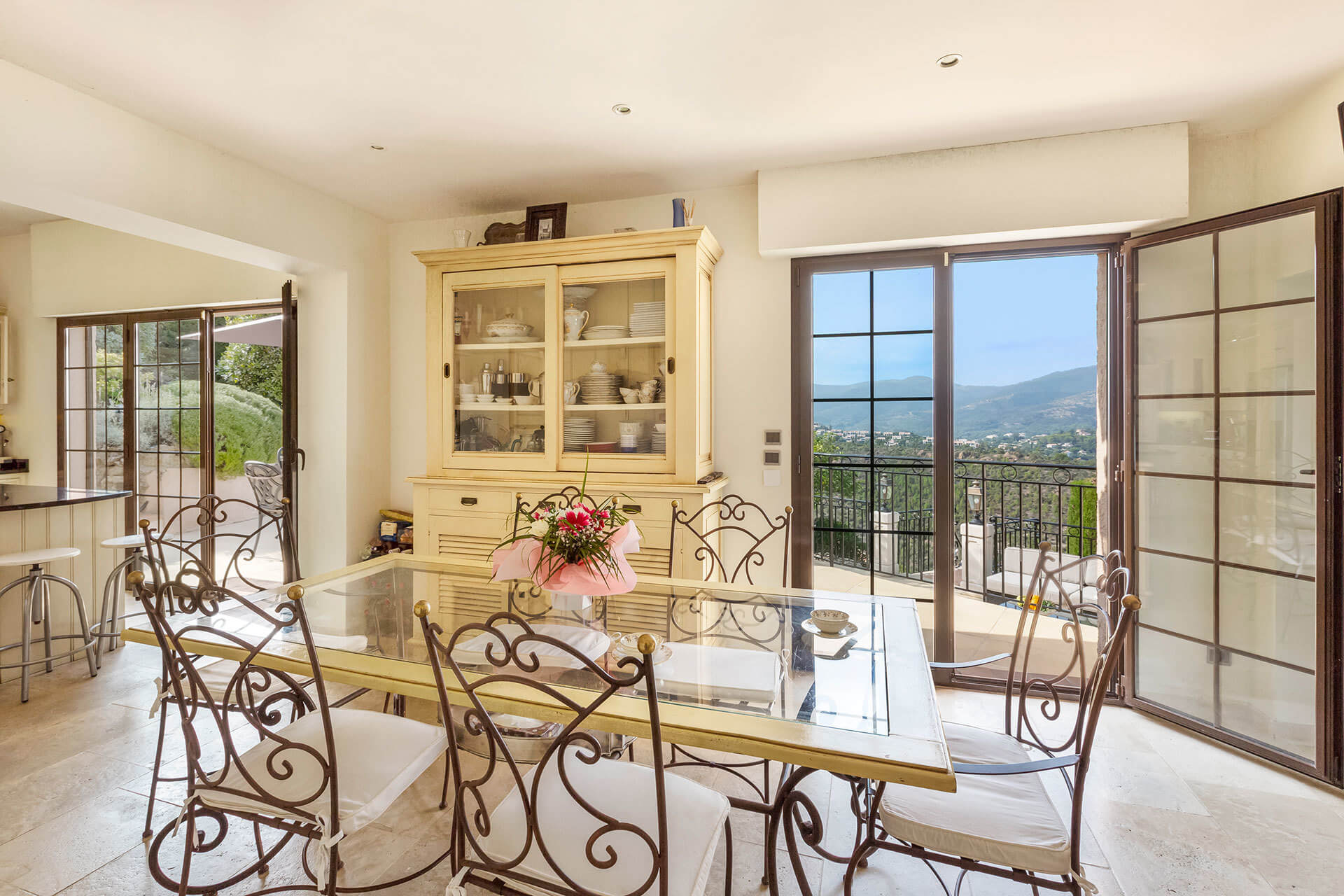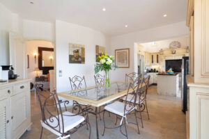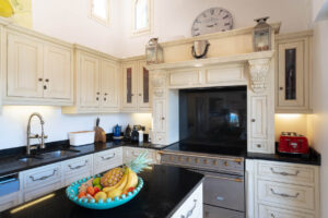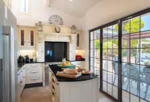 Kitchen With central kitchen island, large American fridge/freezer, large oven/grill with gas hob and double French windows leading out onto the terrace.