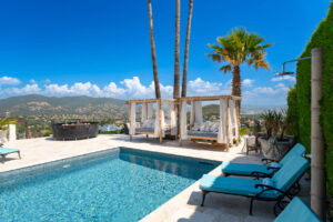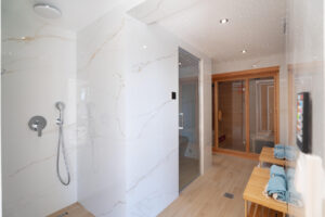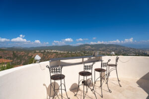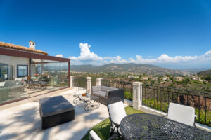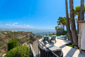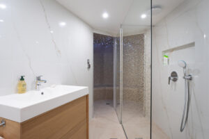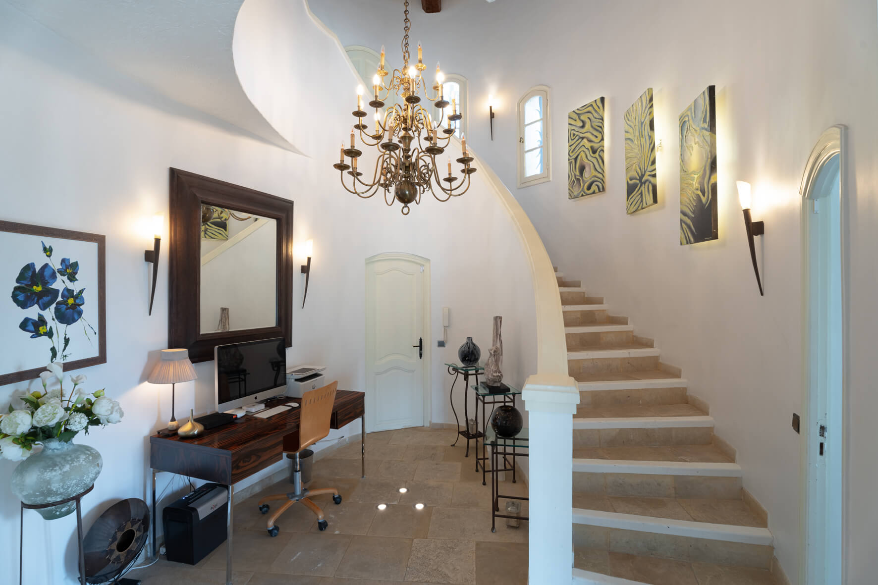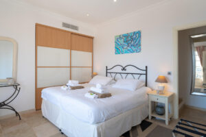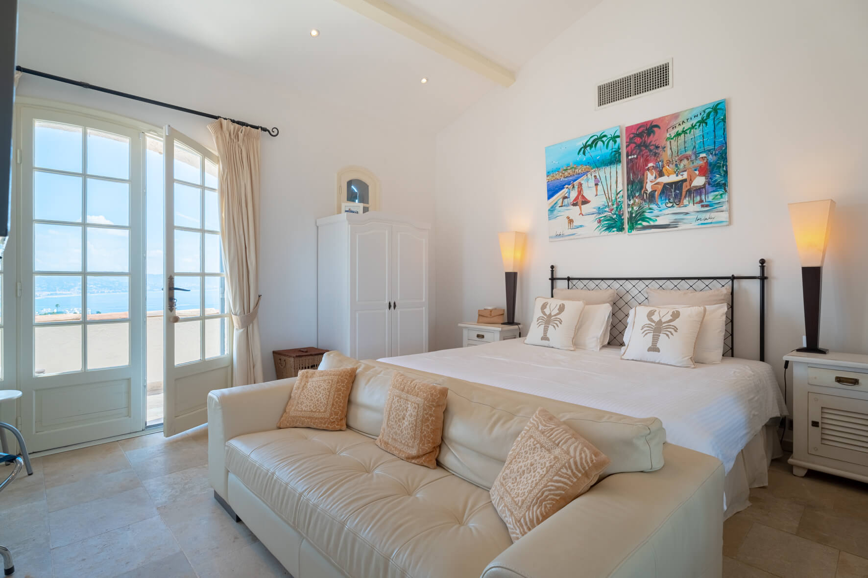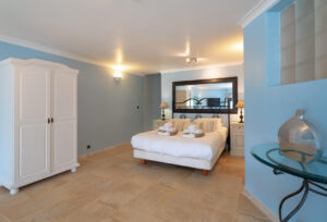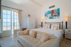 Bedroom 1 2 Master bedroom on entrance level with super king size bed and flatscreen TV, and ensuite shower room, leading onto terrace with panoramic sea views. There is also a study area with sofa.