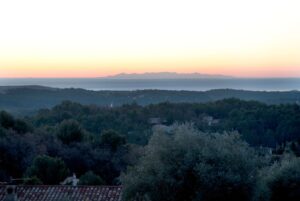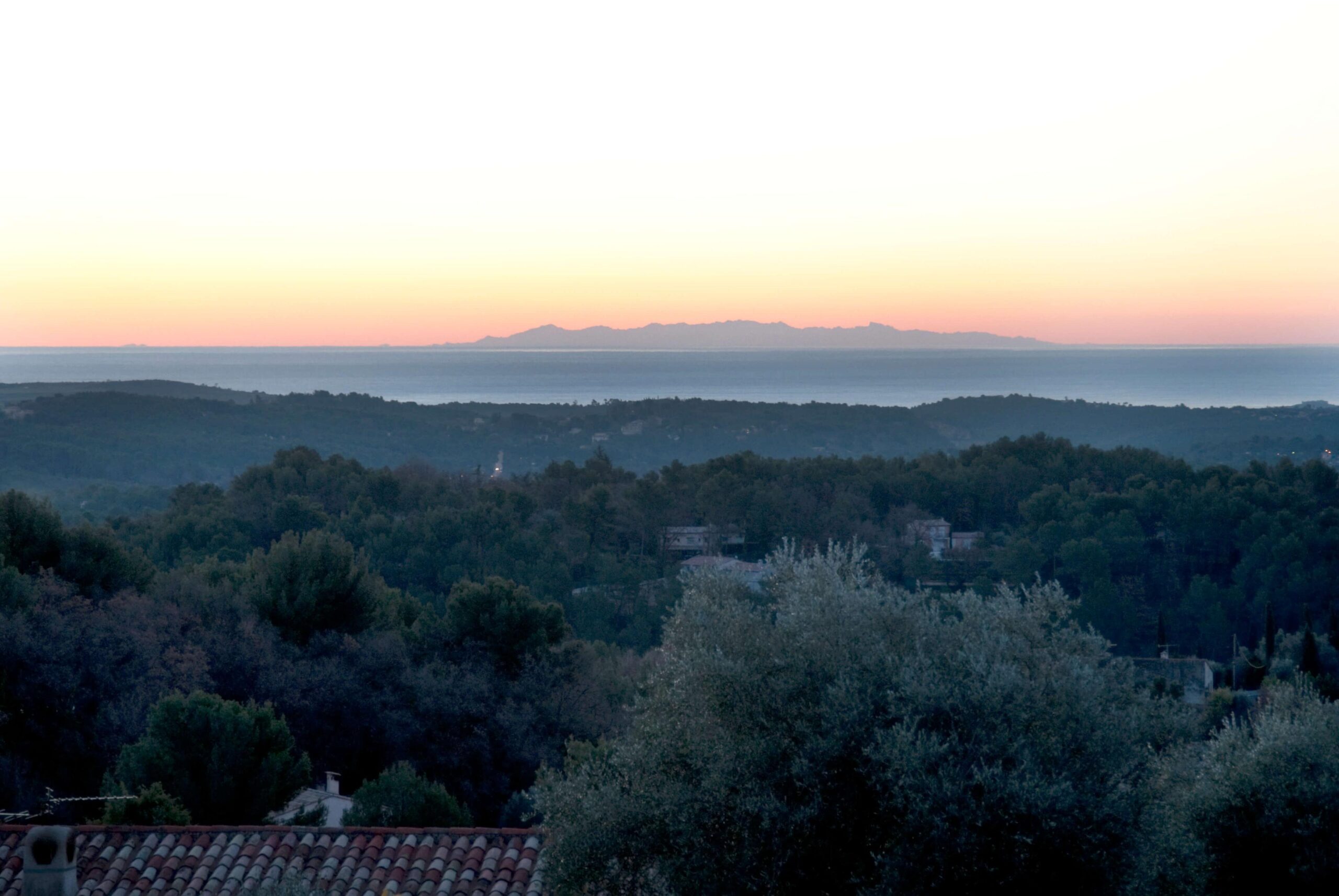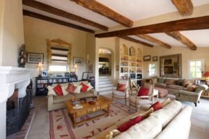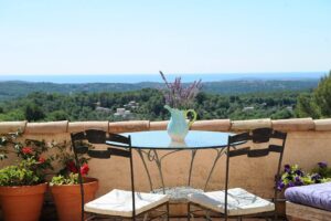 Living Room | TERRACE | The sitting room is a large, open-plan space, with one seating area centred around the log fireplace and the other round the television and library. It has a magnificent panoramic view stretching over 60kms of coastline from Eze to La Napoule. The French windows retract so the room opens up onto the sea view terrace which provides an ideal area for entertaining. There is also a Roland electric piano. | |
