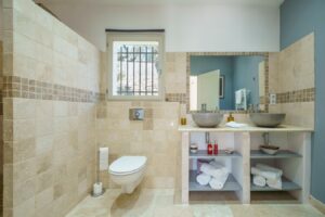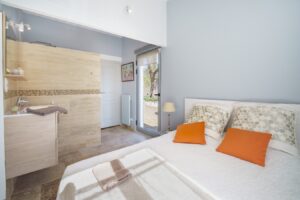 Bedroom 1 2 QUEEN SIZE BED, AIR CONDITIONING Double bedroom with large double bed, flat screen TV, and ensuite bathroom with shower, vanity and toilet